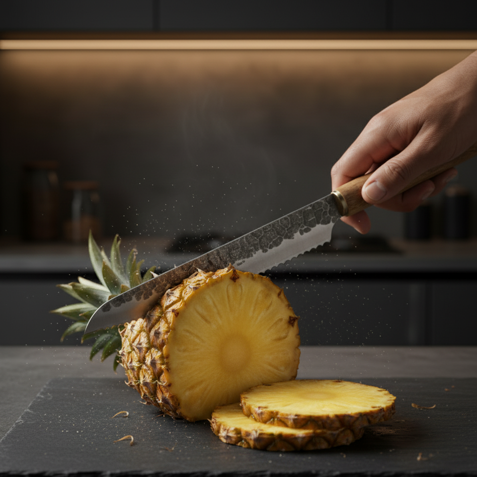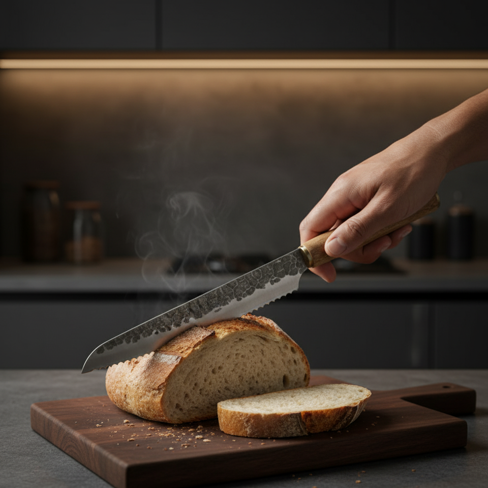 La lame dentelée glisse dans le pain comme un pinceau sur une toile fluide, précis, sans résistance.