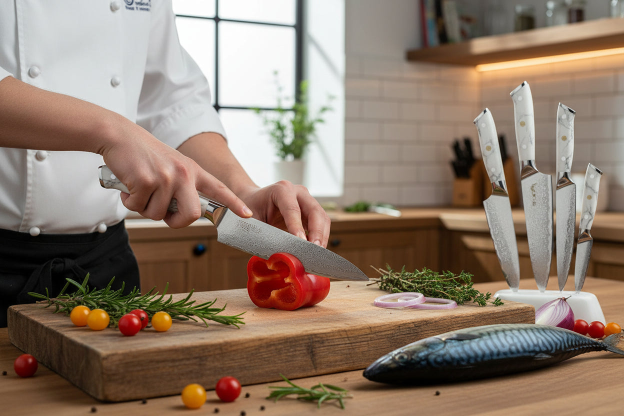 Des couteaux pensés pour la découpe nette, l’équilibre en main et des finitions premium. Une expérience “couteau pro” au quotidien.